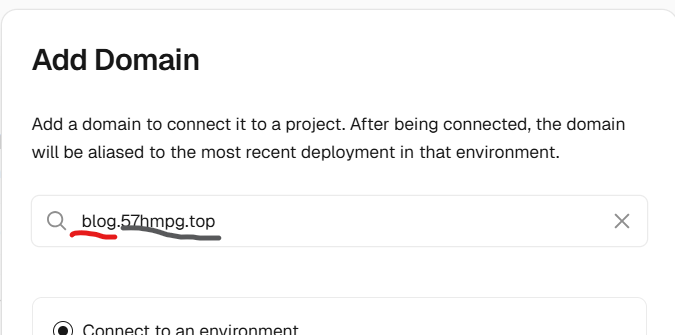 先进入Vercel打开你的项目,点击domian后面的加号,就进入域名的管理页面