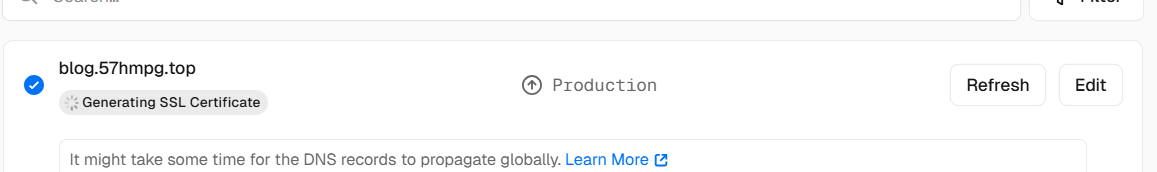 点确定后回到vercel,进行refresh,它正在帮你生成ssl证书