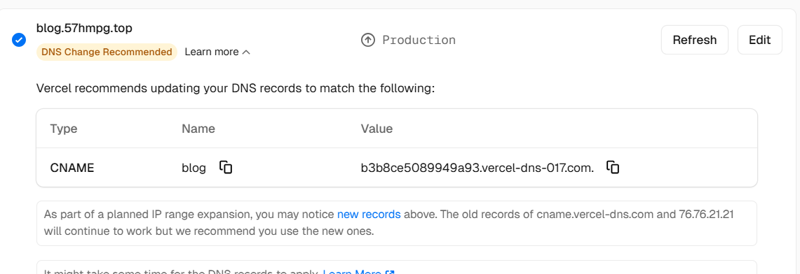 将记录值改好后回到vercel,会发现弹警告,不过不影响,因为此时我们的网站可以正常使用了